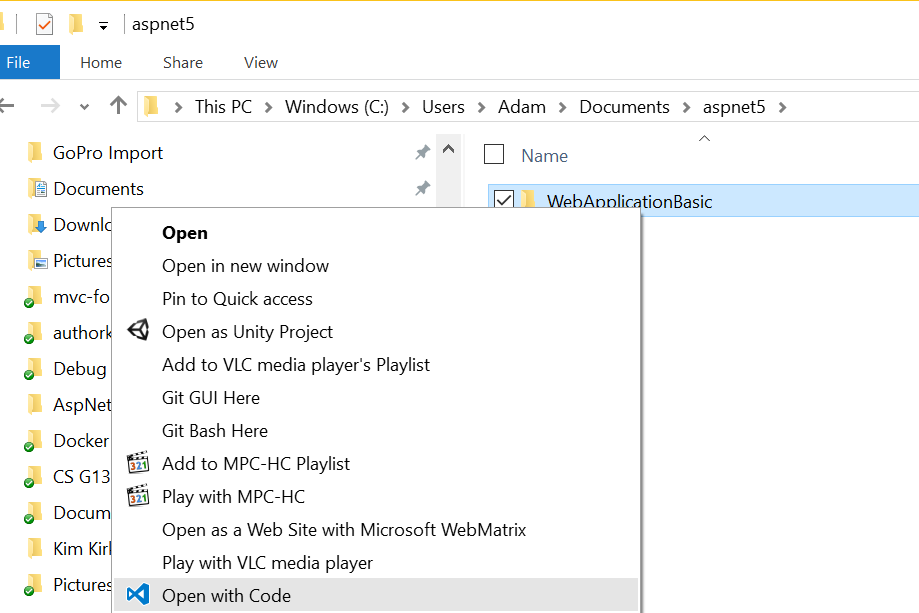 That will generate your project and you can simply right click on that generated folder and open in Visual Studio Code to see your entire project. There's actually a great article on this Visual Studio Code ASP.NET 5 workflow already, so I won't repeat that here.