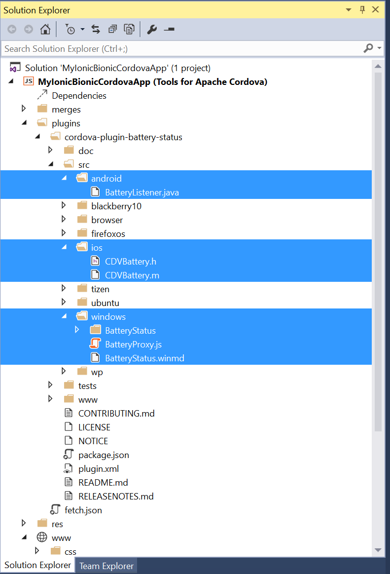 No problem! Visual Studio understands all of the above and you can implement any of those modern web technologies into the project and you can run your Gulp tasks, restore packages, etc. If you are unfamiliar with the above mentioned tools, check out my MSDN Magazine articles on Modern Web Development to get a quick start on them. In short though bower.json, package.json, gruntfile.js, and gulpfile.js are all understood by Visual Studio and can run your tasks (or not - your choice) and manage your package installations and restores inside your Visual Studio Tools for Apache Cordova application.